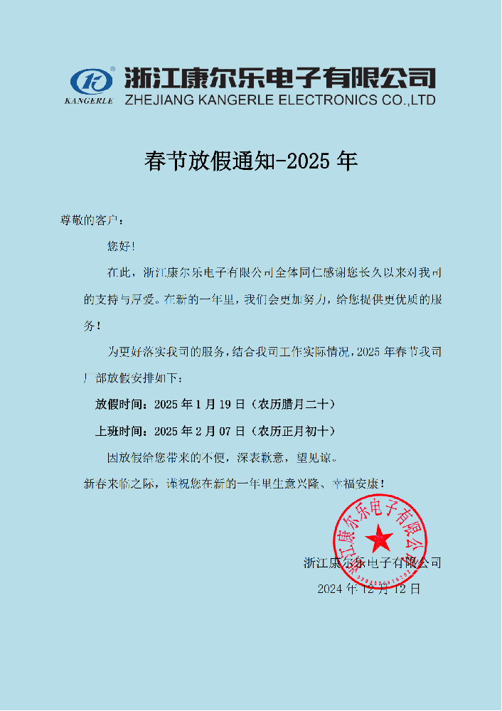 尊敬的客戶:您好!在此,浙江康爾樂電子有限公司全體同仁感謝您長(zhǎng)久以來對(duì)我司的支持與厚愛。在新的一年里,···